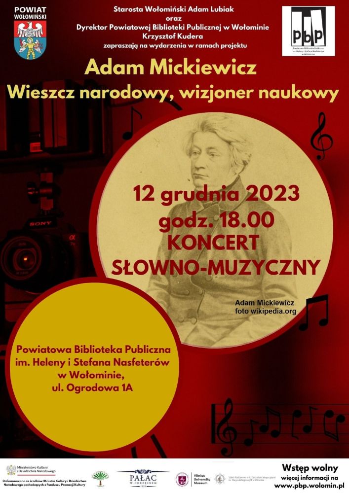Już jutro 12 grudnia 2023, o godz. 18.00, zapraszamy do Powiatowej Biblioteki Publicznej im. Heleny i Stefana Nasfeterów w Wołominie ul. Ogrodowa 1A, na KONCERT SŁOWNO-MUZYCZNY w ramach projektu „Mickiewicz. Wieszcz narodowy, wizjoner naukowy”.