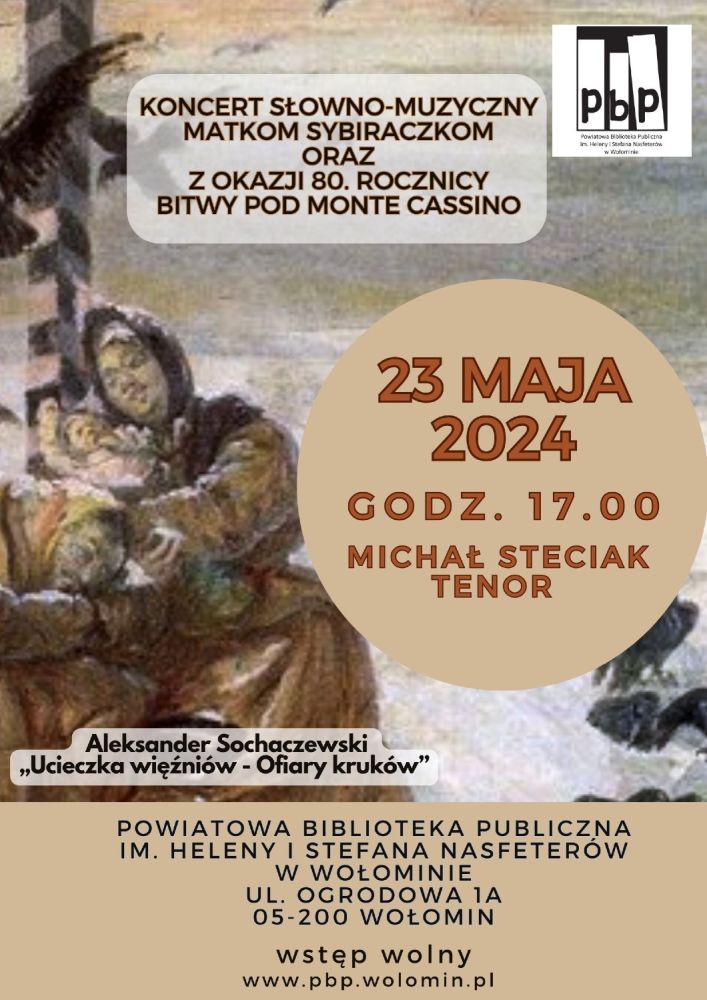23 maja 2024 o godzinie 17.00 zapraszamy do Powiatowej Biblioteki Publicznej im. Heleny i Stefana Nasfeterów w Wołominie ul. Ogrodowa 1A, na wyjątkowy koncert słowno-muzyczny z okazji Dnia Matki dedykowany Matkom Sybiraczkom oraz z okazji 80. rocznicy zwycięskiej Bitwy pod Monte Cassino.