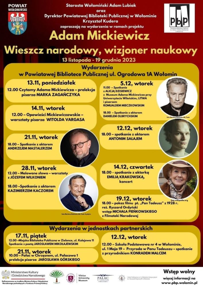 Wczoraj 21.11.2023 r. w Powiatowej Bibliotece Publicznej im. Heleny i Stefana Nasfeterów w Wołominie, ul. Ogrodowa 1A, odbyło się spotkanie w ramach projektu „Mickiewicz. Wieszcz narodowy, wizjoner naukowy”. Podczas Mistrzowskiego Czytania Mickiewicza aktor Andrzej Mastalerz odczytał fragmenty "Pana Tadeusza" Adama Mickiewicza.