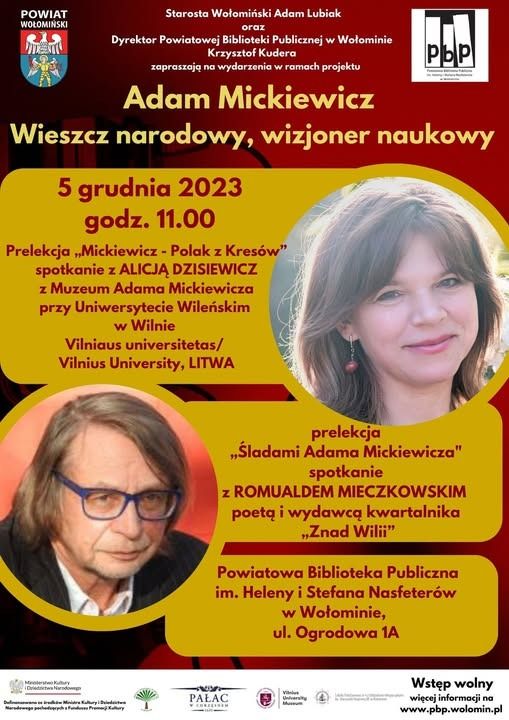Prelekcja pt. „Mickiewicz - Polak z Kresów” – spotkanie z ALICJĄ DZISIEWICZ z Muzeum Adama Mickiewicza przy Uniwersytecie Wileńskim w Wilnie Vilniaus universitetas / Vilnius University, LITWA i ROMUALDEM MIECZKOWSKIM – poetą i wydawcą kwartalnika „Znad Wilii”, który wygłosi prelekcję pt. „Śladami Adama Mickiewicza”.