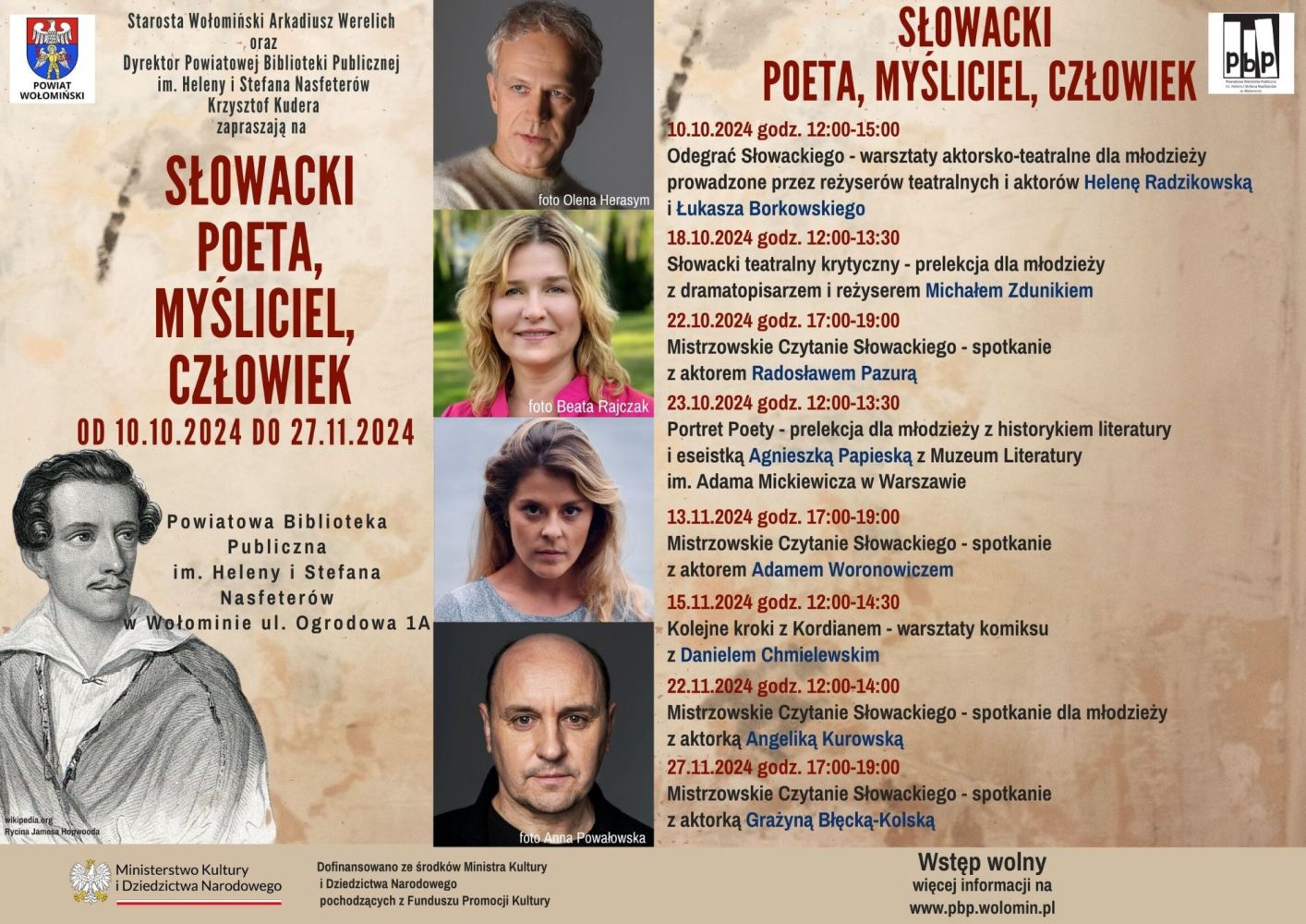 Powiatowa Biblioteka Publiczna im. Heleny i Stefana Nasfeterów w Wołominie zaprasza do uczestnictwa w wydarzeniach przybliżających postać wielkiego poety, wieszcza narodowego Juliusza Słowackiego w ramach projektu "Słowacki. Poeta, myśliciel, człowiek".