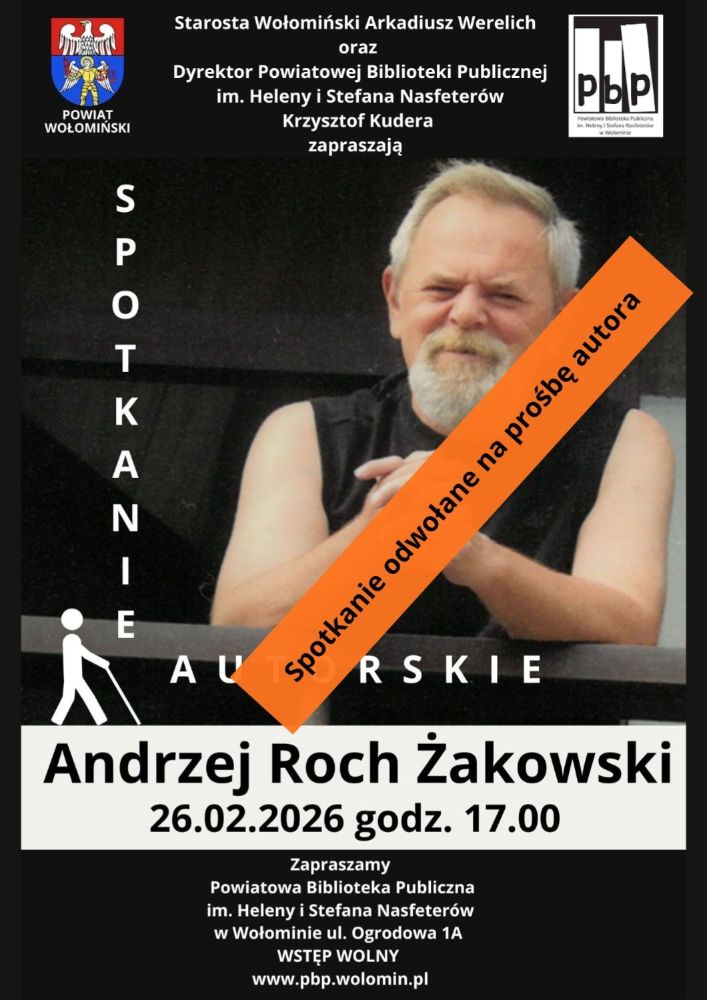 Z przykrością informujemy, że spotkanie autorskie z wołomińskim poetą Andrzejem Rochem Żakowskim planowane na 26 lutego 2026 r. (czwartek) o godz. 17.00 z przyczyn niezależnych od Biblioteki, na prośbę autora zostało odwołane.